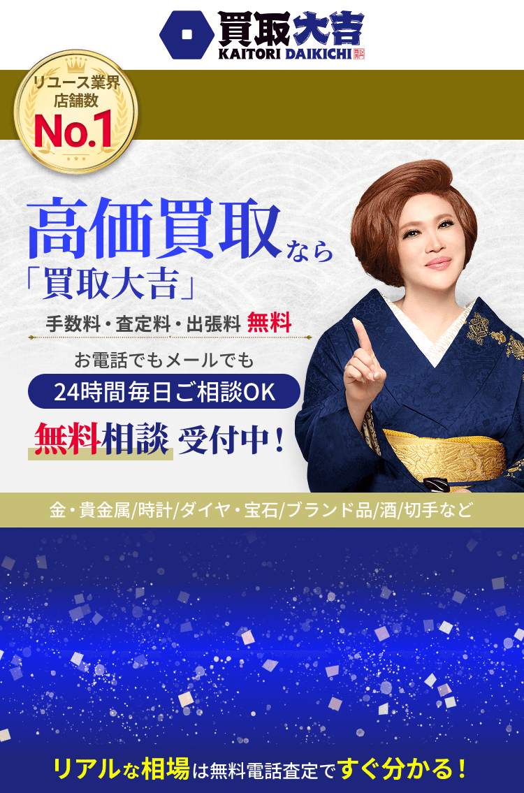 「買取大吉」は、全国0000店舗以上を構える業界最大級の買取専門店です。買取量・販売量が他店よりも多く、薄利でも利益が取れるため、高価買取が可能となっております。