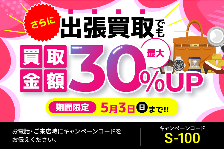 ※キャンペーンには対象店舗、一部対象外商品がございます。キャンペーン適応条件についてはお電話にてご確認ください。※他のキャンペーンとの併用は不可になりますので予めご注意ください※買取金額30%UPキャンペーンは、上限を10万円とします。※当キャンペーンは弊社買取価格からの金額UPになります。