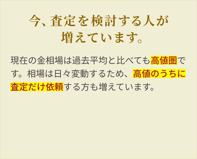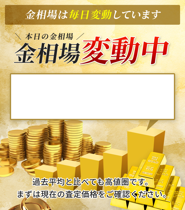 金や貴金属の相場が日々変動する性質上、いつがもっとも良いかは明言できかねます。しかし、過去の金買取相場と比較して、現在は良い相場だと判断できますので、ご売却をご検討いただくタイミングとして、おすすめしております。