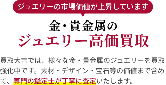 買取大吉ではインゴットなどの金だけでなく、宝飾品である貴金属の買取も強化しております。