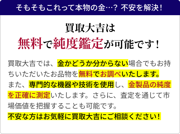 査定させていただいた上で、金と判断できました場合は買取させていただきます。ただ、比重など貴金属の詳細を調べさせていただくのに、少々お時間を頂戴するケースもあり、また査定した結果、貴金属としての取り扱いが難しいケースもありますので、予めご了承ください。