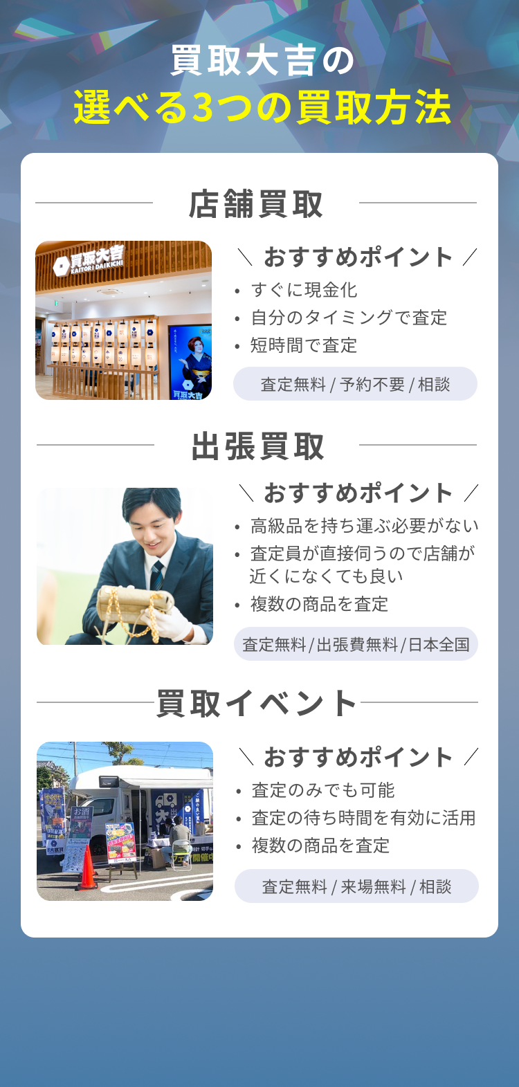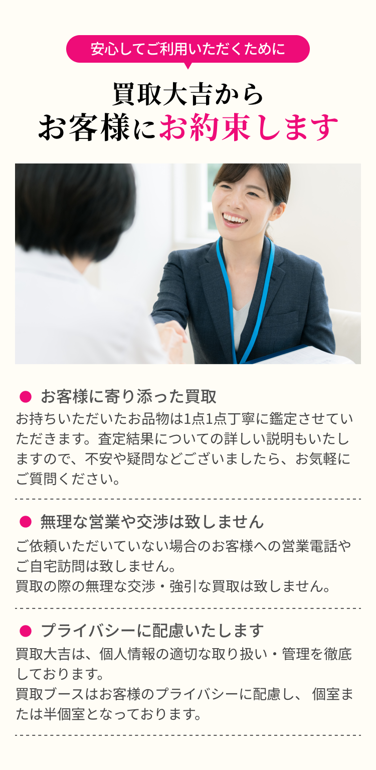 また、店舗にて査定士と直接やり取りをしながらの買取方法となるため、査定理由もわかり他の買取方法と比べて安心感があります。
