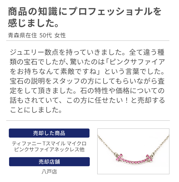 リングを2つほど売却しました。丁寧な説明と接客。口コミ通り店長さんとても良い人でした。売却の価格にも満足しています。ありがとうございます。