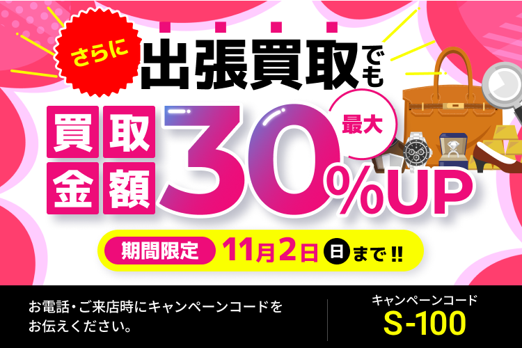 ※キャンペーンには対象店舗、一部対象外商品がございます。キャンペーン適応条件についてはお電話にてご確認ください。※他のキャンペーンとの併用は不可になりますので予めご注意ください※買取金額30%UPキャンペーンは、上限を10万円とします。※当キャンペーンは弊社買取価格からの金額UPになります。