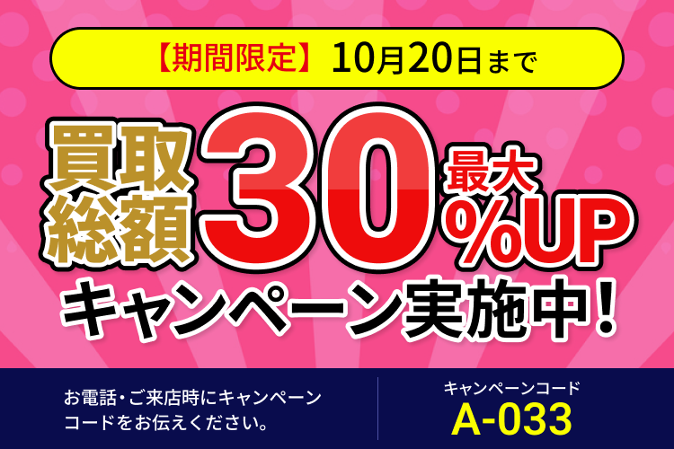 ※キャンペーンには対象店舗がございます。インゴットや板金などの金塊・金券・通貨・切手その他額面のあるものは対象外となります。※買取金額30%UPキャンペーンは、上限を10万円としており、弊社買取価格からの金額アップになります。