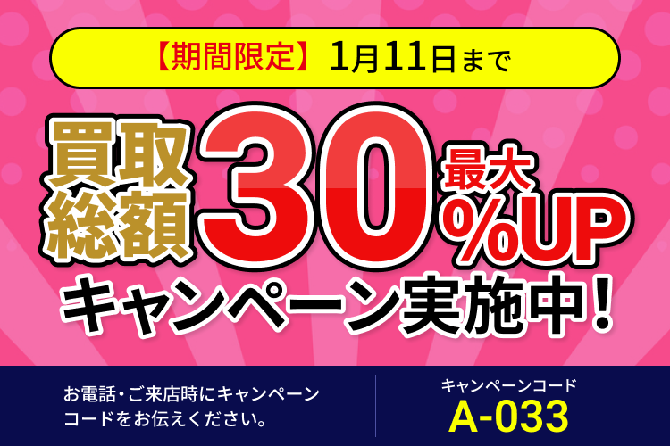 ※キャンペーンには対象店舗がございます。インゴットや板金などの金塊・金券・通貨・切手その他額面のあるものは対象外となります。※買取金額30%UPキャンペーンは、上限を10万円としており、弊社買取価格からの金額アップになります。